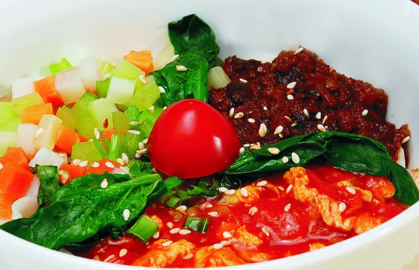 2、碗内放入淡色酱油、盐、辣油及蒜末、榨菜末,加入面条和小白菜拌匀即可。
